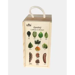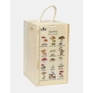 Zestaw „Zgadnij jaki to grzyb ?” zawierający 12 drewnianych wyciętych po konturze elementów przedstawiających 12 grzybów jadalnych i niejadalnych. Z jednej strony znajduje się wizerunek danego gatunku, z drugiej – praktyczny opis. Wymiary drewnianych elementów: od 10 do 18 cm Całość zamknięta w drewnianej skrzyneczce o wymiarach 22×12 cm z zamieszczoną na wieczku legendą.